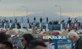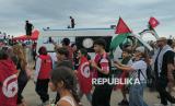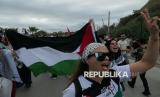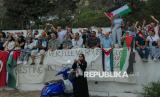 Warga memadati area Pelabuhan Sidi Bou Said untuk mendukung gerakan Global Sumud Flotilla. Gerakan pelayaran akbar menuju gaza tersebut diikuti oleh ratusan relawan dan aktvis dari 44 negara dengan melakukan konvoi menggunakan sekitar 70 kapal mengarungi lautan mediterania hingga mampu menembus perairan Gaza untuk membuka blokade dari Israel sehingga kapal bantuan dapat mengirimkan bantuan kemanusiaan untuk masyarakat Palestina. (FOTO : Republika/Thoudy Badai)