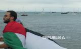 Warga membawa bendera Palestina untuk mendukung para relawan Global Sumud Flotilla saat melakukan training di area Pelabuhan Sidi Bou Said, di Tunisia, Rabu (10/9/2025). (FOTO : Republika/Thoudy Badai)