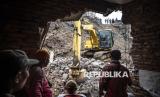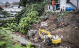 Petugas menggunakan alat berat memindahkan material longsor di Karanganyar Gunung, Candisari, Semarang, Jawa Tengah, Kamis (11/9/2025). Badan Penanggulangan Bencana Daerah (BPBD) Kota Semarang menyebutkan bahwa tanggul setinggi 15 meter dan sepanjang 150 menter itu longsor akibat pondasi lama yang tidak lagi mampu menahan beban setelah diguyur hujan deras pada Rabu (11/9) serta menyebabkan satu rumah mengalami kerusakan dan banjir di kawasan tersebut. (FOTO : ANTARA FOTO/Aprillio Akbar)