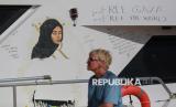 Relawan dan aktivis Global Sumud Flotilla beraktivitas sebelum bertolak menuju Gaza melalui Pelabuhan Bizerte di Tunisia, Ahad (14/9/2025). (FOTO : Republika/Thoudy Badai)