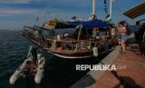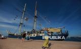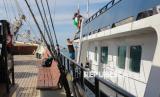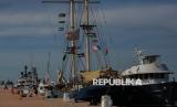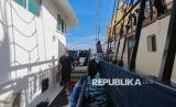 Suasana kapal Global Sumud Flotilla sebelum bertolak menuju Gaza melalui Pelabuhan Bizerte di Tunisia, Ahad (14/9/2025). (FOTO : Republika/Thoudy Badai)
