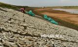Seorang warga menjemur gaplek di tanggul waduk Dawuhan yang airnya menyusut di Kabupaten Madiun, Jawa Timur, Senin (15/9/2025). Waduk yang memiliki daerah irigasi seluas 2.823 hektare sawah tersebut tinggal menyisakan sedikit air dengan sebagian besar dasar waduk mengering hingga tak bisa mengalir ke saluran irigasi akibat musim kemarau.  (FOTO : ANTARA FOTO/Siswowidodo)