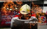 REPUBLIKA.CO.ID, JAKARTA -- Relawan pemadam kebakaran berupaya memadamkan api menggunakan handuk basah dalam Jakarta Fire Safety Challenge 2025 di Kantor Dinas Penanggulangan Kebakaran dan Penyelamatan (Gulkarmat) Provinsi DKI Jakarta, Senin (15/9/2025).