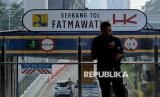 Jurnalis berdiri di depan GT Fatmawati 2 saat pelaksanaan rekayasa lalu lintas di Gerbang Tol (GT) Fatmawati 2 kawasan Jalan TB Simatupang, Jakarta, Senin (15/9/2025). Pemprov DKI Jakarta melakukan uji coba rekayasa lalu lintas dengan skema pembukaan GT Fatmawati 2 paling kiri secara gratis hingga pintu keluar Lebak Bulus. Uji coba ini rencananya akan berlangsung hingga Jumat (19/9) untuk mengatasi kemacetan di kawasan tersebut.  (FOTO : Edwin Putranto/Republika)