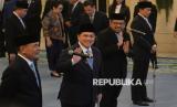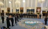 Presiden Prabowo memimpin pengucapan sumpah jabatan saat pelantikan menteri dan wakil menteri Kabinet Merah Putih di Istana Negara, Jakarta, Rabu (17/9/2025). Presiden Prabowo melantik sejumlah pejabat pemerintahan diantaranya Menteri Koordinator Bidang Politik dan Keamanan Djamari Chaniago, Menteri Pemuda dan Olahraga Erick Thohir, Wakil Menteri Ketenagakerjaan Afriansyah Noor, Wakil Menteri Kehutanan Rohmat Marzuki, Wakil Menteri Koperasi Faridah Faridjah, Kepala Badan Komunikasi Pemerintah Angga Raka Prabowo dan Kepala Kantor Staf Kepresidenan M Qodari.  (FOTO : Edwin Putranto/Republika)