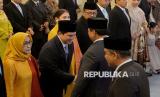 Presiden Prabowo Subianto memberikan ucapan selamat kepada Menteri Koordinator Bidang Politik dan Keamanan Djamari Chaniago seusai pelantikan menteri dan wakil menteri Kabinet Merah Putih di Istana Negara, Jakarta, Rabu (17/9/2025). Presiden Prabowo melantik sejumlah pejabat pemerintahan diantaranya Menteri Koordinator Bidang Politik dan Keamanan Djamari Chaniago, Menteri Pemuda dan Olahraga Erick Thohir, Wakil Menteri Ketenagakerjaan Afriansyah Noor, Wakil Menteri Kehutanan Rohmat Marzuki, Wakil Menteri Koperasi Faridah Faridjah, Kepala Badan Komunikasi Pemerintah Angga Raka Prabowo dan Kepala Kantor Staf Kepresidenan M Qodari.  (FOTO : Edwin Putranto/Republika)