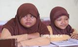 Sejumlah siswi belajar di ruang kelas Sekolah Dasar Negeri Paya Baro, Kecamatan Meureubo, Aceh Barat, Aceh, Sabtu (20/9/2025). Dinas Pendidikan dan Kebudayaan (Disdikbud) Kabupaten Aceh Barat akan menutup tujuh sekolah yang terdiri dari SMP Swasta Kubu Capang, SDN Lueng Baro, SDN Lango Trasmigrasi, SDN Krueng Meulaboh, SDN Alpen 1 Meureubo, SDN Paya Baro dan SDN Cot Buloh disebabkan kekurangan siswa atau jumlah siswa yang tidak memenuhi standar. (FOTO : ANTARA FOTO/Syifa Yulinnas)