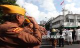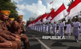REPUBLIKA.CO.ID, SURABAYA -- Sejumlah veteran dan melakukan penghormatan kepada bendera Merah Putih saat pementasan drama teatrikal kolosal berjudul Surabaya Merah Putih di Hotel Majapahit, Surabaya, Jawa Timur, Ahad (21/9/2025).