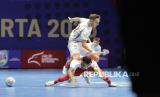 Pemain Timnas futsal Indonesia Ardiansyah Nur terjatuh saat berusaha melewati adangan pemain Timnas futsal Latvia pada turnamen Futsal Four Nations Cup 2025 di GBK Basket Hall, Senayan, Jakarta, Ahad (21/9/2025). Timnas Futsal Latvia berhasil menjuarai turnamen Futsal Four Nations Cup 2025 usai mengalahkan Timnas Futsal Indonesia dengan skor 3-2. (Difoto dengan Canon Eos R5 Mark II dan Lensa Canon RF 70-200mm f/2.8 L IS USM Z). (FOTO : Edwin Putranto/Republika)