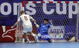 Penjaga gawang Timnas futsal Indonesia Ahmad Habiebie berusaha menghalau tendangan pemain Timnas futsal Latvia pada turnamen Futsal Four Nations Cup 2025 di GBK Basket Hall, Senayan, Jakarta, Ahad (21/9/2025). Timnas Futsal Latvia berhasil menjuarai turnamen Futsal Four Nations Cup 2025 usai mengalahkan Timnas Futsal Indonesia dengan skor 3-2. (Difoto dengan Canon Eos R5 Mark II dan Lensa Canon RF 70-200mm f/2.8 L IS USM Z). (FOTO : Edwin Putranto/Republika)