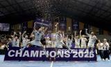 Timnas futsal Latvia melakukan selebrasi usai menjuarai turnamen Futsal Four Nations Cup 2025 di GBK Basket Hall, Senayan, Jakarta, Ahad (21/9/2025). Timnas Futsal Latvia berhasil menjadi juara usai mengalahkan Timnas Futsal Indonesia dengan skor 3-2. (Difoto dengan Canon Eos R5 Mark II dan Lensa Canon RF 24-70mm f/2.8 L IS USM Z). (FOTO : Edwin Putranto/Republika)