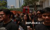 Mahasiswa Universitas Katolik Indonesia Atma Jaya menggelar aksi memperingati 26 Tahun Tragedi Semanggi II di Kampus Universitas Kalotik Indonesia Atma Jaya, Semanggi, Jakarta, Rabu (24/9/2025). Dalam aksi tersebut sejumlah mahasiswa melakukan orasi, berdoa bersama hingga menabur bunga. (FOTO : Republika/Thoudy Badai)