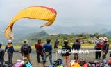 Peserta mengembangkan parasutnya saat mengikuti kejuaran paralayang internasional pada ajang West Java Paragliding Championship di Batu Dua, Cisitu, Kabupaten Sumedang, Jawa Barat, Sabtu (27/9/2025). West Java Paragliding Championship yang diikuti oleh 120 peserta dari 18 negara di Benua Eropa, Amerika dan Asia tersebut digelar sebagai ajang untuk mendongkrak pariwisata di Kabupaten Sumedang serta pencarian bakat potensial dalam negeri untuk bersaing di kompetisi Internasional. (FOTO : ANTARA FOTO/Raisan Al Farisi)