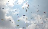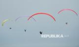 REPUBLIKA.CO.ID, SUMEDANG -- Peserta mengudara di atas Waduk Jatigede saat mengikuti kejuaran paralayang internasional pada ajang West Java Paragliding Championship di Batu Dua, Cisitu, Kabupaten Sumedang, Jawa Barat, Sabtu (27/9/2025).