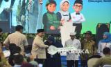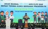 REPUBLIKA.CO.ID, BOGOR -- Presiden Prabowo Subianto menyerahkan kunci rumah kepada perwakilan penerima KPR FLPP pada acara akad massal KPR Sejahtera FLPP dan serah terima kunci di Perumahan Pesona Kahuripan 10, Cileungsi, Kabupaten Bogor, Jawa Barat, Senin (29/9/2025).
