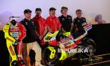 Pemilik Tim Pertamina Enduro VR46 Racing Team Valentino Rossi (kedua kanan) bersama pebalap MotoGP dari tim Pertamina Enduro VR46 Racing Team Franco Morbidelli (tengah), Direktur Utama PT Pertamina Lubricants Werry Prayogi(kanan), Team Director Pertamina Enduro VR46 Racing Team Uccio Salucci (kiri), dan pebalap Fabio Di Giannantonio (kedua kiri) saat acara Launching Special Livery Pertamina Enduro VR46 Racing Team for Indonesia di Senayan Park, Jakarta, Selasa (30/9/2025). PT Pertamina Lubricants yang merupakan sponsor utama tim Pertamina Enduro VR46 Racing Team meluncurkan livery khusus bernuansa Indonesia untuk MotoGP Mandalika. Motor Fabio Di Giannantonio dan Franco Morbidelli yang digunakan dalam sesi balap MotoGP Mandalika bakal menggunakan livery dengan warna merah putih khas bendera Indonesia serta sentuhan batik di livery motor Ducati VR46 Racing Team. (FOTO : Republika/Thoudy Badai)