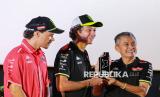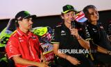 Pemilik Tim Pertamina Enduro VR46 Racing Team Valentino Rossi (tengah) bersama pebalap MotoGP dari tim Pertamina Enduro VR46 Racing Team Franco Morbidelli (kiri) Direktur Utama PT Pertamina Lubricants Werry Prayogi (kanan) saat acara Launching Special Livery Pertamina Enduro VR46 Racing Team for Indonesia di Senayan Park, Jakarta, Selasa (30/9/2025). PT Pertamina Lubricants yang merupakan sponsor utama tim Pertamina Enduro VR46 Racing Team meluncurkan livery khusus bernuansa Indonesia untuk MotoGP Mandalika. Motor Fabio Di Giannantonio dan Franco Morbidelli yang digunakan dalam sesi balap MotoGP Mandalika bakal menggunakan livery dengan warna merah putih khas bendera Indonesia serta sentuhan batik di livery motor Ducati VR46 Racing Team. (FOTO : Republika/Thoudy Badai)