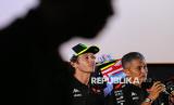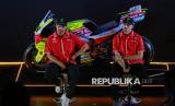 Pebalap MotoGP dari tim Pertamina Enduro VR46 Racing Team Franco Morbidelli (kiri) dan Fabio Di Giannantonio (kanan) saat acara Launching Special Livery Pertamina Enduro VR46 Racing Team for Indonesia di Senayan Park, Jakarta, Selasa (30/9/2025). PT Pertamina Lubricants yang merupakan sponsor utama tim Pertamina Enduro VR46 Racing Team meluncurkan livery khusus bernuansa Indonesia untuk MotoGP Mandalika. Motor Fabio Di Giannantonio dan Franco Morbidelli yang digunakan dalam sesi balap MotoGP Mandalika bakal menggunakan livery dengan warna merah putih khas bendera Indonesia serta sentuhan batik di livery motor Ducati VR46 Racing Team. (FOTO : Republika/Thoudy Badai)
