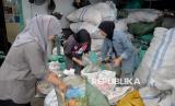 Petugas Bank Sampah Gunung Emas binaan PT Pegadaian memilah sampah plastik yang ditukarkan warga di Rawamangun, Jakarta Timur, Selasa (30/9/2025). Bank Sampah Gunung Emas binaan PT Pegadaian memiliki 277 nasabah yang memanfaatkan tabungan emas Pegadaian. Setiap bulannya, Bank Sampah Gunung Emas mengumpulkan sampah plastik hingga 15 ton. PT Pegadaian berkomitmen untuk terus mendorong pengelolaan sampah di Indonesia salah satunya dengan program The Gade Clean and Gold Memilah Sampah Menabung Emas. Langkah ini merupakan bagian dari pengembangan sistem Bank Emas yang terintegrasi dalam rangka #mengEMASkanindonesia. (FOTO : Edwin Putranto/Republika)