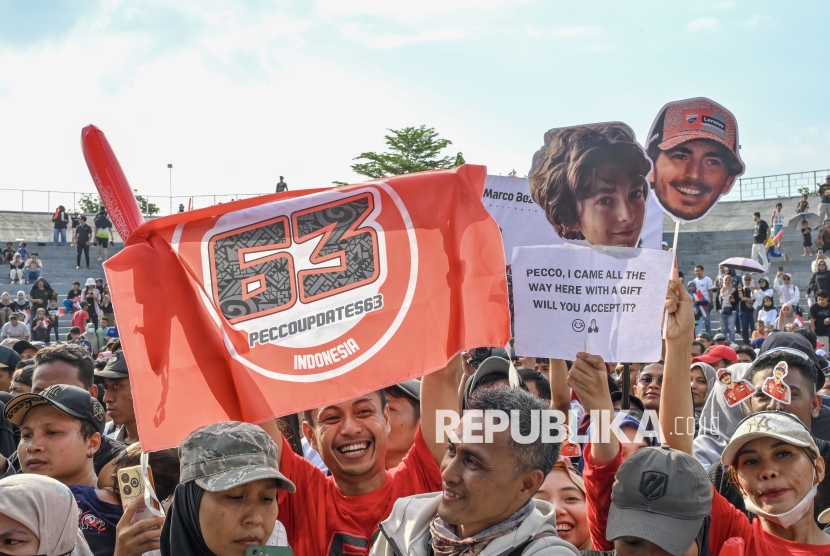 Sejumlah penggemar Francesco Bagnaia memajang poster saat mengikuti MotoGP Riders Parade di Jalan Udayana, Mataram, NTB, Rabu (1/10/2025). Parade yang diikuti 10 pembalap nasional dan internasional di antaranya Francesco Bagnaia, Marco Bezzecchi, Luca Marini, Brad Binder, Miguel Oliveira, Raul Fernandez, Franco Morbidelli, Fabio Di Giannantonio, Somkiat Chantra, dan Mario Aji tersebut digelar untuk memeriahkan Pertamina Grand Prix Of Indonesia 2025 seri ke 18 yang akan diselenggarakan di Sirkuit Mandalika pada 3 hingga 5 Oktober 2025. (FOTO : ANTARA FOTO/Ahmad Subaidi)