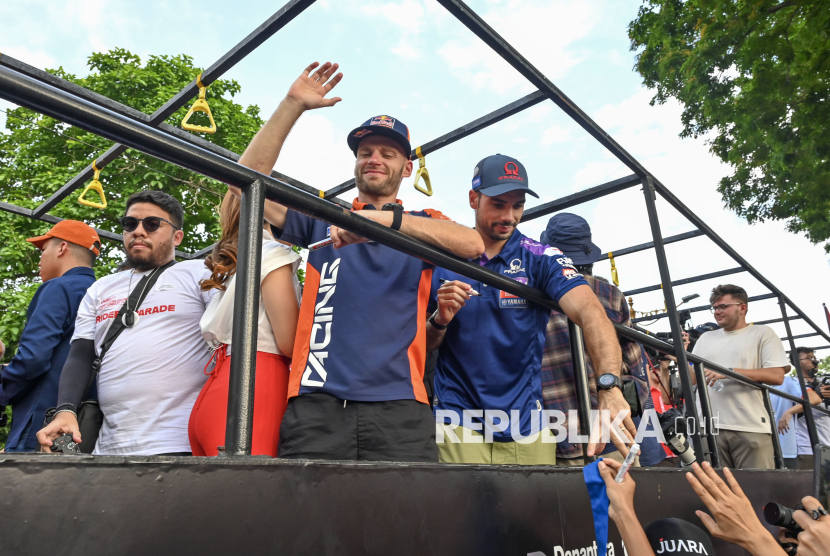Pembalap Prima Pramac Yamaha MotoGP Miguel Oliveira (kanan) bersama pembalap Red Bull KTM Factory Racing Brad Binder (kiri) melambaikan tangannya saat mengikuti MotoGP Riders Parade di Jalan Udayana, Mataram, NTB, Rabu (1/10/2025). Parade yang diikuti 10 pembalap nasional dan internasional di antaranya Francesco Bagnaia, Marco Bezzecchi, Luca Marini, Brad Binder, Miguel Oliveira, Raul Fernandez, Franco Morbidelli, Fabio Di Giannantonio, Somkiat Chantra, dan Mario Aji tersebut digelar untuk memeriahkan Pertamina Grand Prix Of Indonesia 2025 seri ke 18 yang akan diselenggarakan di Sirkuit Mandalika pada 3 hingga 5 Oktober 2025. (FOTO : ANTARA FOTO/Ahmad Subaidi)