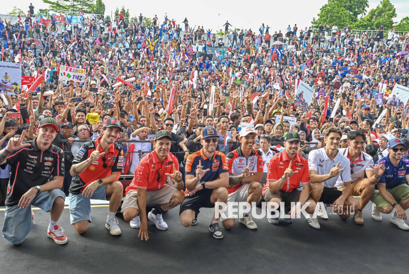 Sejumlah pembalap MotoGP berpose dengan penggemarnya saat mengikuti MotoGP Riders Parade di Jalan Udayana, Mataram, NTB, Rabu (1/10/2025). Parade yang diikuti 10 pembalap nasional dan internasional di antaranya Francesco Bagnaia, Marco Bezzecchi, Luca Marini, Brad Binder, Miguel Oliveira, Raul Fernandez, Franco Morbidelli, Fabio Di Giannantonio, Somkiat Chantra, dan Mario Aji tersebut digelar untuk memeriahkan Pertamina Grand Prix Of Indonesia 2025 seri ke 18 yang akan diselenggarakan di Sirkuit Mandalika pada 3 hingga 5 Oktober 2025. (FOTO : ANTARA FOTO/Ahmad Subaidi)