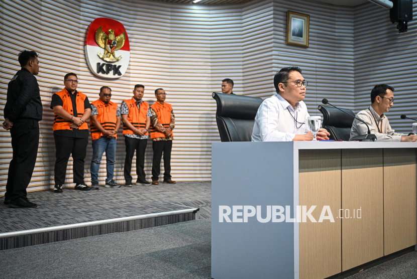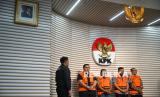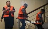 REPUBLIKA.CO.ID, JAKARTA -- Anggota DPRD Jawa Timur Hasanuddin, mantan Kepala Desa di Kabupaten Tulungagung Sukar, pihak swasta dari Kabupaten Blitar Jodi Pradana Putra dan pihak swasta dari Tulungagung Wawan Kristiawan menggunakan rompi tahanan usai menjalani pemeriksaan di Gedung Merah Putih KPK, Jakarta, Kamis (2/10/2025).
