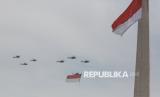Pesawat tempur T-50i Golden Eagle melakukan atraksi saat gladi bersih Hari Ulang Tahun (HUT) ke-80 Tentara Nasional Indonesia (TNI) di Monas, Jakarta, Jumat (3/10/2025). Gladi bersih tersebut digelar dalam rangka persiapan HUT ke-80 TNI yang mengerahkan sekitar 140 ribu pasukan TNI pada Minggu, 5 Oktober 2025 (FOTO : Republika/Thoudy Badai)