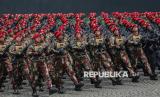 Prajurit TNI melakukan defile saat gladi bersih Hari Ulang Tahun (HUT) ke-80 Tentara Nasional Indonesia (TNI) di Monas, Jakarta, Jumat (3/10/2025). Gladi bersih tersebut digelar dalam rangka HUT ke-80 TNI yang mengerahkan sekitar 140 ribu pasukan TNI pada Minggu, 5 Oktober 2025. (FOTO : Republika/Thoudy Badai)