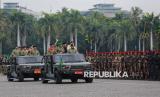 Panglima Jenderal TNI Agus Subiyanto meninjau pasukan saat gladi bersih Hari Ulang Tahun (HUT) ke-80 Tentara Nasional Indonesia (TNI) di Monas, Jakarta, Jumat (3/10/2025). Gladi bersih tersebut digelar dalam rangka HUT ke-80 TNI yang mengerahkan sekitar 140 ribu pasukan TNI pada Minggu, 5 Oktober 2025. (FOTO : Republika/Thoudy Badai)