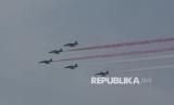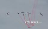 Pesawat Jupiter Aerobatic Team TNI AU membentuk formasi terbang saat gladi bersih Hari Ulang Tahun (HUT) ke-80 Tentara Nasional Indonesia (TNI) di Monas, Jakarta, Jumat (3/10/2025). Gladi bersih tersebut digelar dalam rangka persiapan HUT ke-80 TNI yang mengerahkan sekitar 140 ribu pasukan TNI pada Minggu, 5 Oktober 2025. (FOTO : Republika/Thoudy Badai)