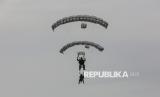 Prajurit TNI melakukan aksi terjung payung saat gladi bersih Hari Ulang Tahun (HUT) ke-80 Tentara Nasional Indonesia (TNI) di Monas, Jakarta, Jumat (3/10/2025). Gladi bersih tersebut digelar dalam rangka HUT ke-80 TNI yang mengerahkan sekitar 140 ribu pasukan TNI pada Minggu, 5 Oktober 2025. (FOTO : Republika/Thoudy Badai)
