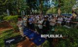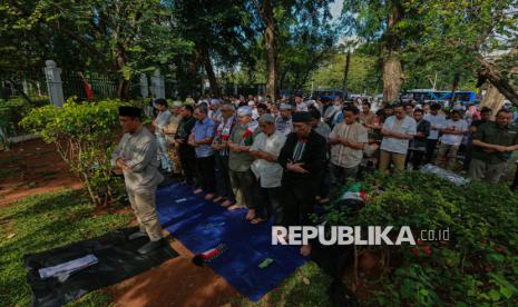 Massa yang tergabung dalam Indonesia Global Peace Convoy (IGPC) dan Solidaritas Palestina melaksanakan shalat ashar di sela-sela aksi di depan Kedutaan Besar Amerika Serikat untuk Indonesia di Jakarta, Jumat (3/10/2025). Dalam aksinya, massa mengecam tindakan Israel atas penculikan terhadap ratusan relawan dan aktivis Global Sumud Flotilla (GSF) di perairan internasional saat akan menyalurkan bantuan kemanusiaan kepada warga Gaza melalui jalur laut. Selain itu, massa menuntut pemerintah Israel untuk segera menghentikan pembantaian terhadap warga Palestina dan membuka koridor kemanusiaan. (FOTO : Republika/Thoudy Badai)