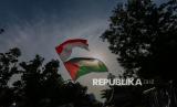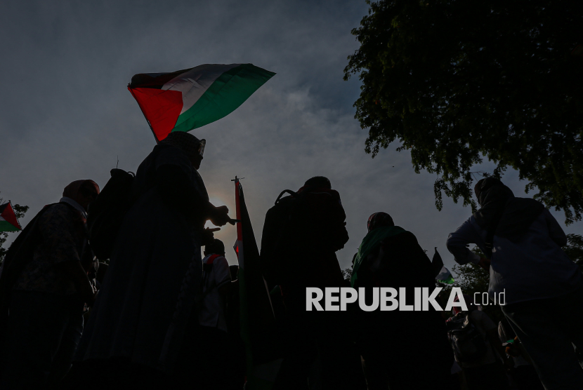 Massa yang tergabung dalam Indonesia Global Peace Convoy (IGPC) dan Solidaritas Palestina menggelar aksi di depan Kedutaan Besar Amerika Serikat untuk Indonesia di Jakarta, Jumat (3/10/2025). Dalam aksinya, massa mengecam tindakan Israel atas penculikan terhadap ratusan relawan dan aktivis Global Sumud Flotilla (GSF) di perairan internasional saat akan menyalurkan bantuan kemanusiaan kepada warga Gaza melalui jalur laut. Selain itu, massa menuntut pemerintah Israel untuk segera menghentikan pembantaian terhadap warga Palestina dan membuka koridor kemanusiaan. (FOTO : Republika/Thoudy Badai)