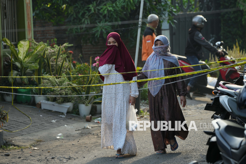 Warga berjalan disekitar lokasi Pondok Pesantren (Ponpes) Al Khoziny di Kecamatan Buduran, Sidoarjo, Jawa Timur, Sabtu (4/10/2025). Kepala Pusat Data, Informasi dan Komunikasi Kebencanaan BNPB, Abdul Muhari menyatakan total korban tercatat sebanyak 167 orang, 118 orang telah ditemukan dengan rincian 103 orang selamat, 14 orang meninggal dunia dan satu orang kembali ke rumah tanpa memerlukan penanganan medis lanjutan dan sebanyak 49 orang diduga masih tertimbun material bangunan. (FOTO : AP Photo/Achmad Ibrahim)