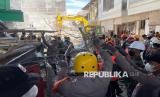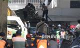Petugas gabungan mengangkat material bangunan mushala ambruk di Pondok Pesantren (Ponpes) Al Khoziny di Kecamatan Buduran, Sidoarjo, Jawa Timur, Sabtu (4/10/2025). Kepala Pusat Data, Informasi dan Komunikasi Kebencanaan BNPB, Abdul Muhari menyatakan total korban tercatat sebanyak 167 orang, 118 orang telah ditemukan dengan rincian 103 orang selamat, 14 orang meninggal dunia dan satu orang kembali ke rumah tanpa memerlukan penanganan medis lanjutan dan sebanyak 49 orang diduga masih tertimbun material bangunan. (FOTO : AP Photo/Trisnadi)