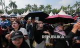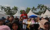 Warga memadati area Monumen Nasional (Monas) untuk menyaksikan peringatan HUT ke-80 TNI di kawasan Silang Monas, Jakarta, Ahad (5/10/2025). Pada peringatan HUT ke-80 TNI mengangkat tema besar TNI Prima, TNI Rakyat, Indonesia Maju. Selain upacara, gelaran HUT ke-80 TNI ini menampilkan sejumlah atraksi pesawat tempur, terjung payung, pengibaran bendera Merah Putih di atas langit Jakarta hingga simulasi pembebasan tawanan oleh pasukan TNI. (FOTO : Republika/Thoudy Badai)