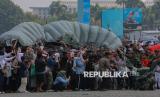 Prajuti TNI saat mendarat usai atraksi terjun payung dalam acara peringatan HUT ke-80 TNI di Monumen Nasional (Monas), Jakarta, Ahad (5/10/2025). Pada peringatan HUT ke-80 TNI mengangkat tema besar TNI Prima, TNI Rakyat, Indonesia Maju. Selain upacara, gelaran HUT ke-80 TNI ini menampilkan sejumlah atraksi pesawat tempur, terjung payung, pengibaran bendera Merah Putih di atas langit Jakarta hingga simulasi pembebasan tawanan oleh pasukan TNI. (FOTO : Republika/Thoudy Badai)