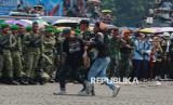 Prajurit TNI menggendong warga yang pingsan saat menyaksikan peringatan HUT ke-80 TNI di kawasan Silang Monas, Jakarta, Ahad (5/10/2025). Pada peringatan HUT ke-80 TNI mengangkat tema besar TNI Prima, TNI Rakyat, Indonesia Maju. Selain upacara, gelaran HUT ke-80 TNI ini menampilkan sejumlah atraksi pesawat tempur, terjung payung, pengibaran bendera Merah Putih di atas langit Jakarta hingga simulasi pembebasan tawanan oleh pasukan TNI. (FOTO : Republika/Thoudy Badai)
