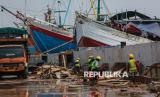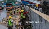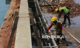 Pekerja menyelesaikan proyek pembangunan tanggul beton di Pelabuhan Sunda Kelapa, Jakarta, Rabu (8/10/2025). Proyek pembangunan tanggul sepanjang sekitar 1,2 kilometer tersebut ditargetkan rampung pada pertengahan bulan November 2025 mendatang yang diharapkan mampu mengantisipasi potensi banjir pasang air laut atau rob. Sementara banjir rob yang terjadi di kawasan Pelabuhan Sunda Kelapa pada Selasa (7/10) kemarin diakibatkan oleh limpahan air laut dari area pelabuhan yang masih ditanggul oleh sandbag barrier karena proyek pembangunan tanggul beton belum rampung menyeluruh. (FOTO : Republika/Thoudy Badai)