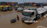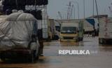 Kendaraan truk melintas area genangan banjir rob di Kawasan Pelabuhan Sunda Kelapa, Jakarta, Rabu (8/10/2025). Banjir rob yang terjadi di kawasan Pelabuhan Sunda Kelapa diakibatkan oleh limpahan air laut dari area pelabuhan yang masih ditanggul oleh sandbag barrier karena proyek pembangunan tanggul beton belum rampung menyeluruh. (FOTO : Thoudy Badai/Republika)