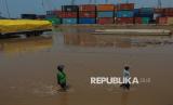 Pekerja beraktivitas saat banjir rob di Kawasan Pelabuhan Sunda Kelapa, Jakarta, Rabu (8/10/2025). Banjir rob yang terjadi di kawasan Pelabuhan Sunda Kelapa diakibatkan oleh limpahan air laut dari area pelabuhan yang masih ditanggul oleh sandbag barrier karena proyek pembangunan tanggul beton belum rampung menyeluruh. (FOTO : Republika/Thoudy Badai)