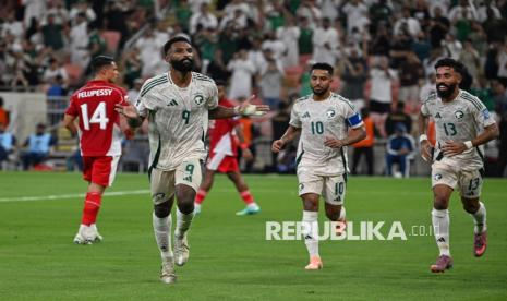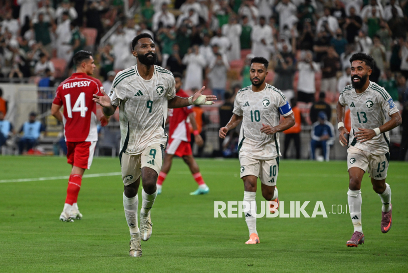 Pesepak bola Arab Saudi Feras Albrikan melakukan selebrasi seusai mencetak gol ke gawang Indonesia pada pertandingan putaran keempat Kualifikasi Piala Dunia 2026 zona Asia di Stadion King Abdullah Sport City, Jeddah, Arab Saudi, Rabu (8/10/2025). Indonesia dikalahkan Arab Saudi dengan skor akhir 2-3. (FOTO : AP Photo)