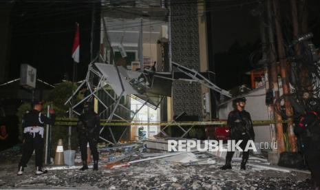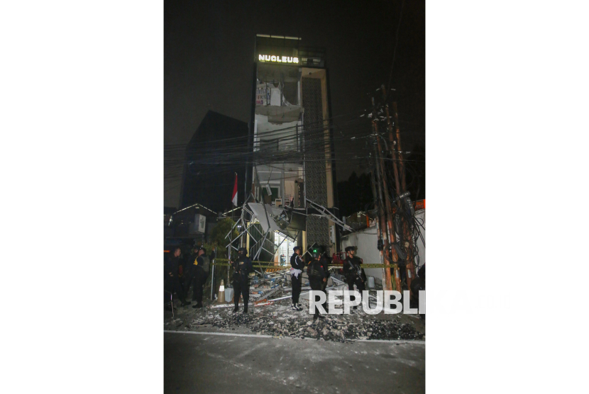 Sejumlah personil Gegana Brimob Polda Metro Jaya berjaga di depan tempat terjadinya ledakan misterius di Kantor Nucleus Farma di Jombang Pondok Aren, Tangerang Selatan, Banten, Rabu (8/10/2025). Ledakan yang menghancurkan ruko empat lantai tersebut belum diketahui penyebabnya. (FOTO : ANTARA FOTO/Muhammad Iqbal)