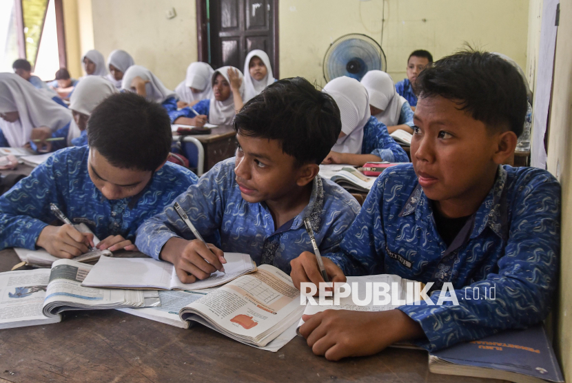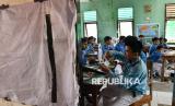 REPUBLIKA.CO.ID, BEKASI -- Tiga orang siswa menggunakan satu meja belajar di Unit Sekolah Baru (USB) SMP 62 Medan Satria, Bekasi, Jawa Barat, Kamis (9/10/2025).