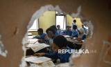 Sejumlah murid belajar disamping pembatas ruang kelas yang rusak di Unit Sekolah Baru (USB) SMP 62 Medan Satria, Bekasi, Jawa Barat, Kamis (9/10/2025). Menurut pihak Sekolah sebanyak 320 siswa menggunakan hanya empat ruang kelas yang layak digunakan karena sudah tiga tahun bangunan lainnya rusak. (FOTO : ANTARA FOTO/Fakhri Hermansyah)