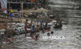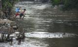 Anak-anak bermain di bantaran Sungai Ciliwung di kawasan Manggarai, Jakarta, Kamis (9/10/2025). Kegiatan sore di bantaran Sungai Ciliwung di kawasan tersebut tampak beragam, mulai dari anak-anak yang bermain dan berenang, hingga warga yang memanfaatkan aliran sungai untuk mencuci pakaian dan membersihkan diri. Namun, di sisi lain, masih terdapat warga yang tetap membuang sampah ke sungai. (FOTO : Republika/Prayogi)