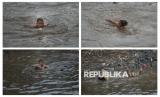 Warga mengamati anak-anak yang bermain di bantaran Sungai Ciliwung di kawasan Manggarai, Jakarta, Kamis (9/10/2025). Kegiatan sore di bantaran Sungai Ciliwung di kawasan tersebut tampak beragam, mulai dari anak-anak yang bermain dan berenang, hingga warga yang memanfaatkan aliran sungai untuk mencuci pakaian dan membersihkan diri. Namun, di sisi lain, masih terdapat warga yang tetap membuang sampah ke sungai. (FOTO : Republika/Prayogi)