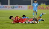 Pesepak bola Timnas Indonesia U-23 Kadek Arel Priyatna terjatuh seusai dijegal pesepak bola Timnas India pada laga persahabatan di Stadion Madya, Kompleks GBK, Jakarta, Jumat (10/10/2025). Indonesia dikalahkan India dengan skor 1-2. (FOTO : Edwin Putranto/Republika)