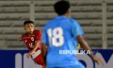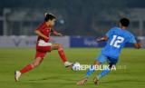 Pesepak bola Timnas Indonesia U-23 Ricky Pratama melepaskan tendangan ke gawang India pada laga persahabatan di Stadion Madya, Kompleks GBK, Jakarta, Jumat (10/10/2025). Indonesia dikalahkan India dengan skor 1-2. (FOTO : Edwin Putranto/Republika)